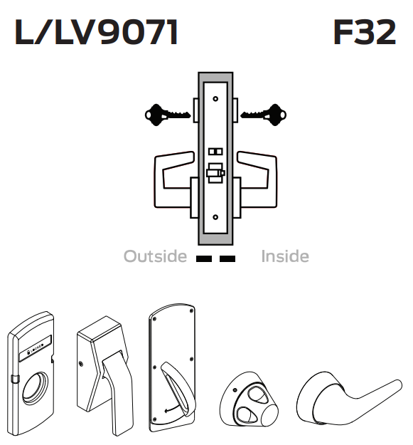 • Outside lever is made inoperative by key from either side; Vandlgard® option allows outside lever to rotate freely down while locked