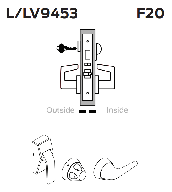 • Outside lever is made inoperative when deadbolt is thrown by key outside; rotating thumbturn 20° locks outside lever only; rotating thumbturn 90° also throws deadbolt; Vandlgard® option allows outside lever to rotate freely down while locked